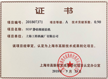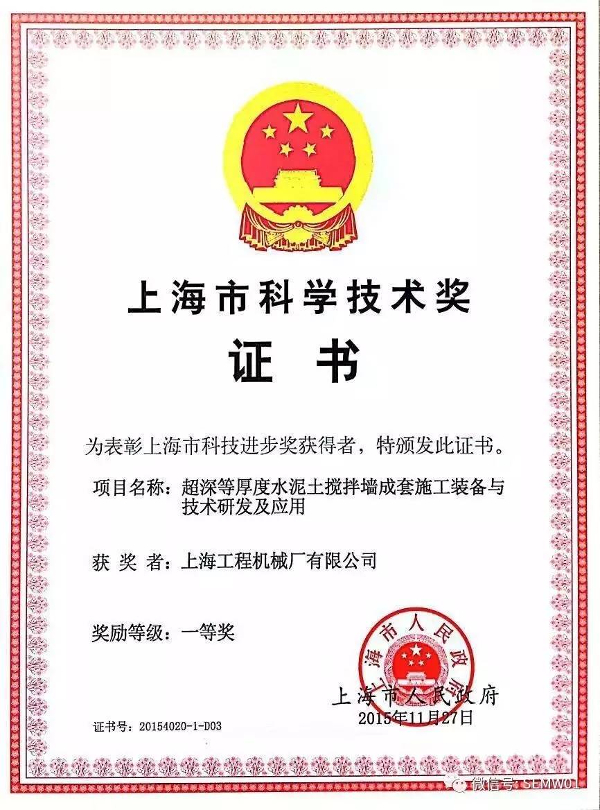 金菱牌打樁機多次獲得上海市名牌産品和上海市著名商标稱号,D系列超大斷面(miàn)球墨鑄鐵筒式柴油打樁錘于2006年獲得上海市科技進(jìn)步三等獎,TRD-D工法機以“超深等厚度水泥土攪拌牆成(chéng)套設備與技術研發(fā)及應用”分别于2016年和2017年獲得上海市科技進(jìn)步一等獎和國(guó)家科學(xué)技術進(jìn)步二等獎;累計有JB160A步履樁架、ZLD180/85-3-M-CS地下連續牆鑽孔機、D220超大噸位筒式柴油錘、DCM處理系統、SDP靜鑽根植鑽機和TRD-D工法機等項目通過(guò)上海市高新技術成(chéng)果轉化項目認定。
