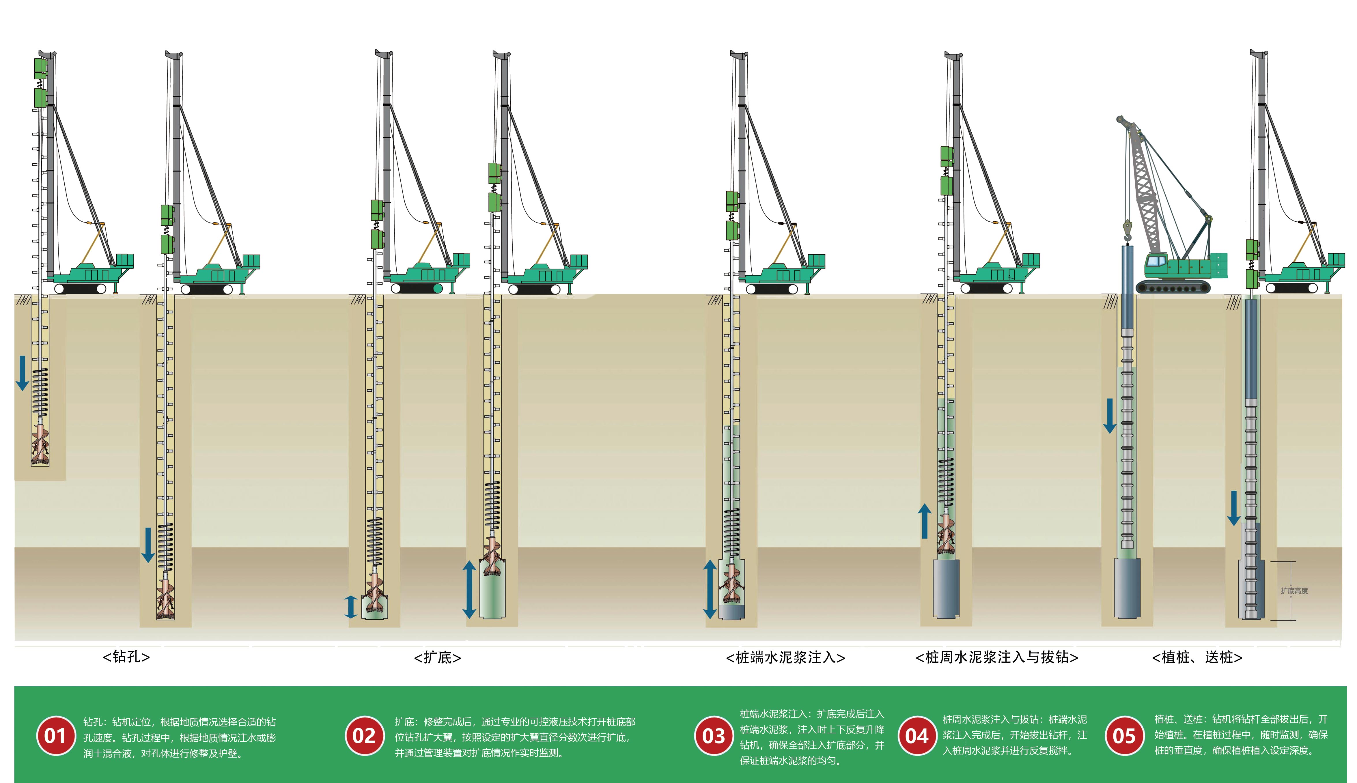 靜鑽根植工法是利用靜鑽根植樁工法鑽機進(jìn)行鑽孔、深層攪拌和擴底注漿攪拌,最後(hòu)植入預制樁,即指將(jiāng)先張法預應力混凝土竹節樁(PHDC)、先張法預應力混凝土管樁(PHC)、複合配筋預應力混凝土管樁(PRHC)的不同規格、型号爲滿足設計要求進(jìn)行各種(zhǒng)組合,并按鑽孔、擴孔、注漿、植入等工藝進(jìn)行施工的樁基工法。