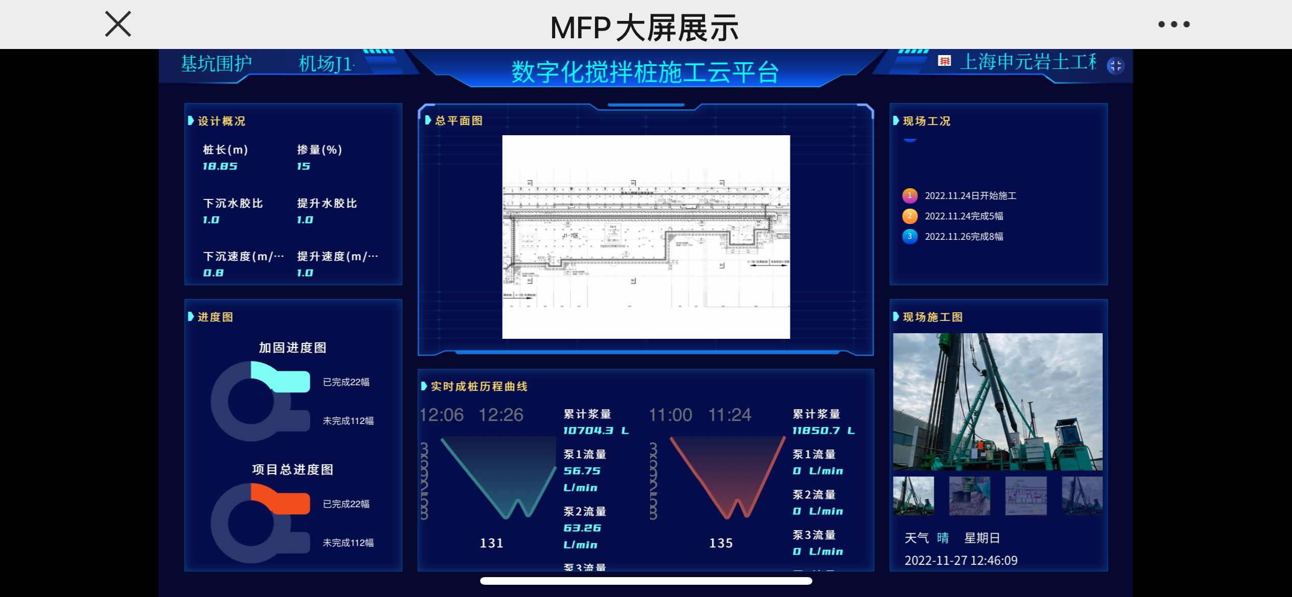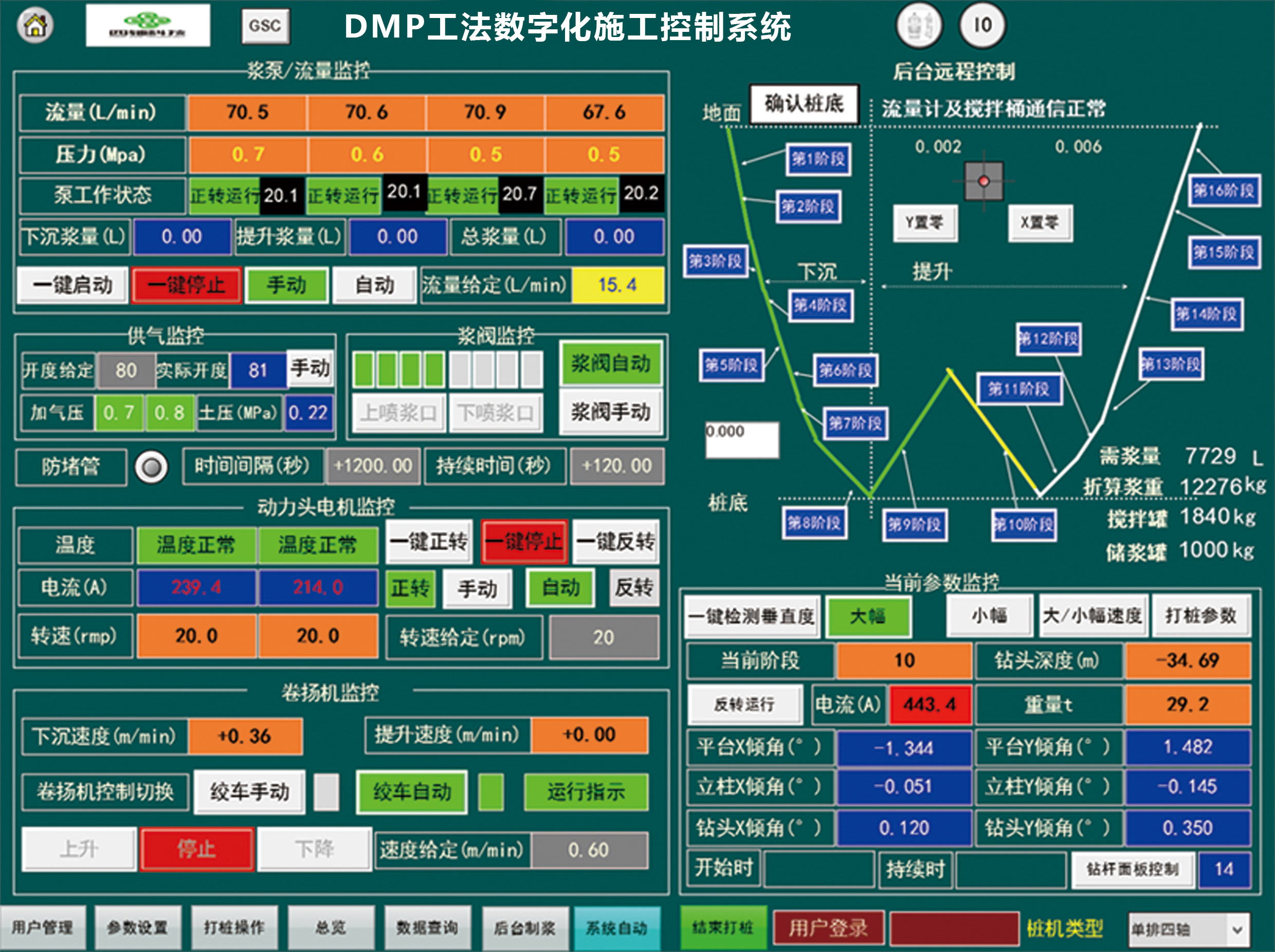 數字化施工控制系統采集并顯示的内容包括噴漿壓力、漿液流量、噴氣壓力、地内壓力、成(chéng)樁深度、成(chéng)樁速度、成(chéng)樁垂直度等參數;可生成(chéng)包含樁長(cháng)、施工時(shí)間、地内壓力、水泥用量、成(chéng)樁垂直度等參數的施工記錄表;同時(shí)可將(jiāng)施工參數上傳至集控中心,實現對(duì)施工過(guò)程的實時(shí)監控。