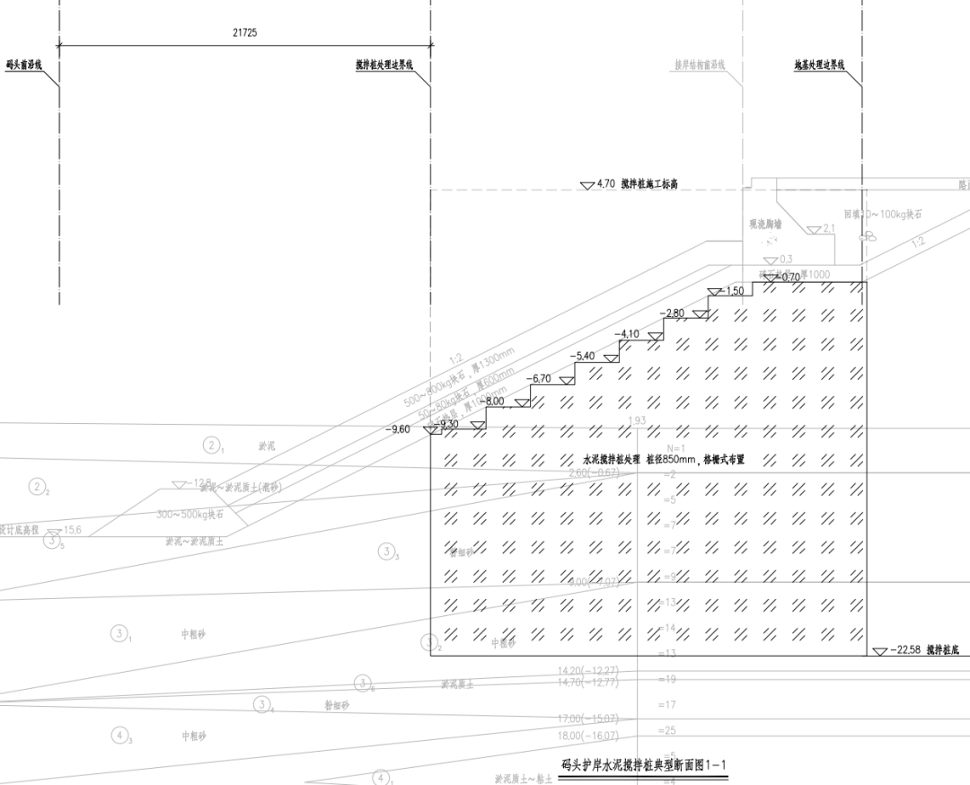 項目地基處理總面(miàn)積約49.3萬㎡,地基處理分區共分爲1~9九個大區。其中, 7區爲碼頭護岸開(kāi)挖邊坡加固區域,采用四軸水泥攪拌樁處理,項目所需四軸攪拌樁實樁總方量138273m³,樁數3757副、樁徑Ф850@650、樁深17.6~31.5米、水泥摻量爲爲18%。