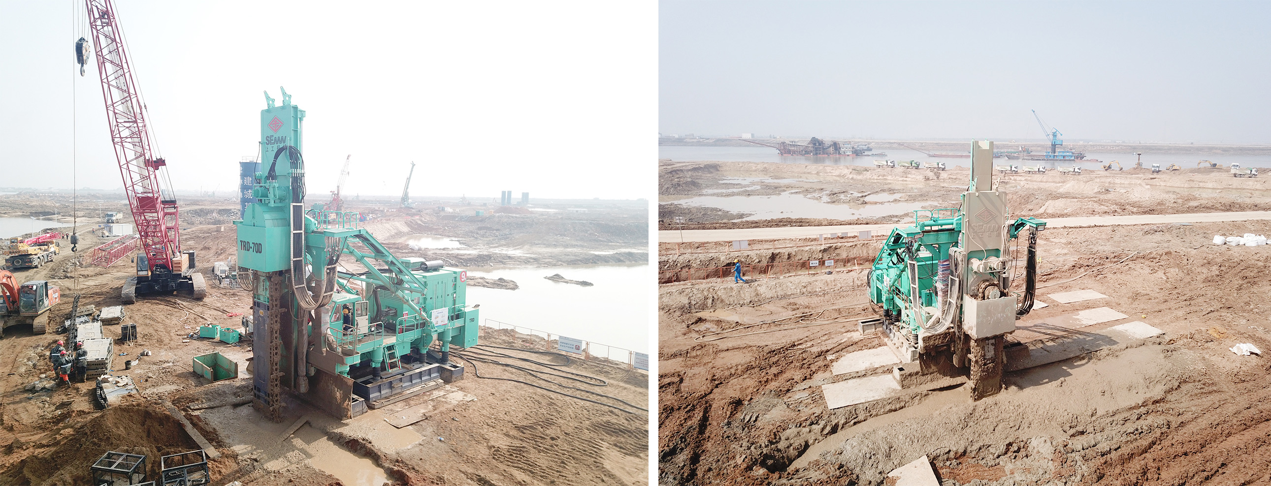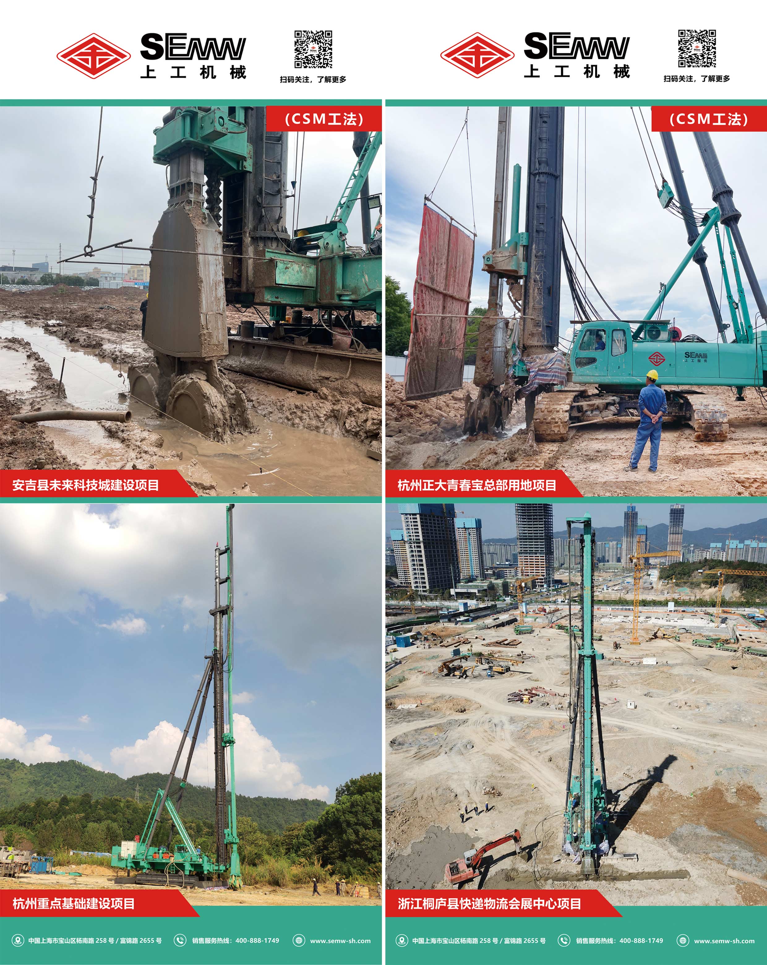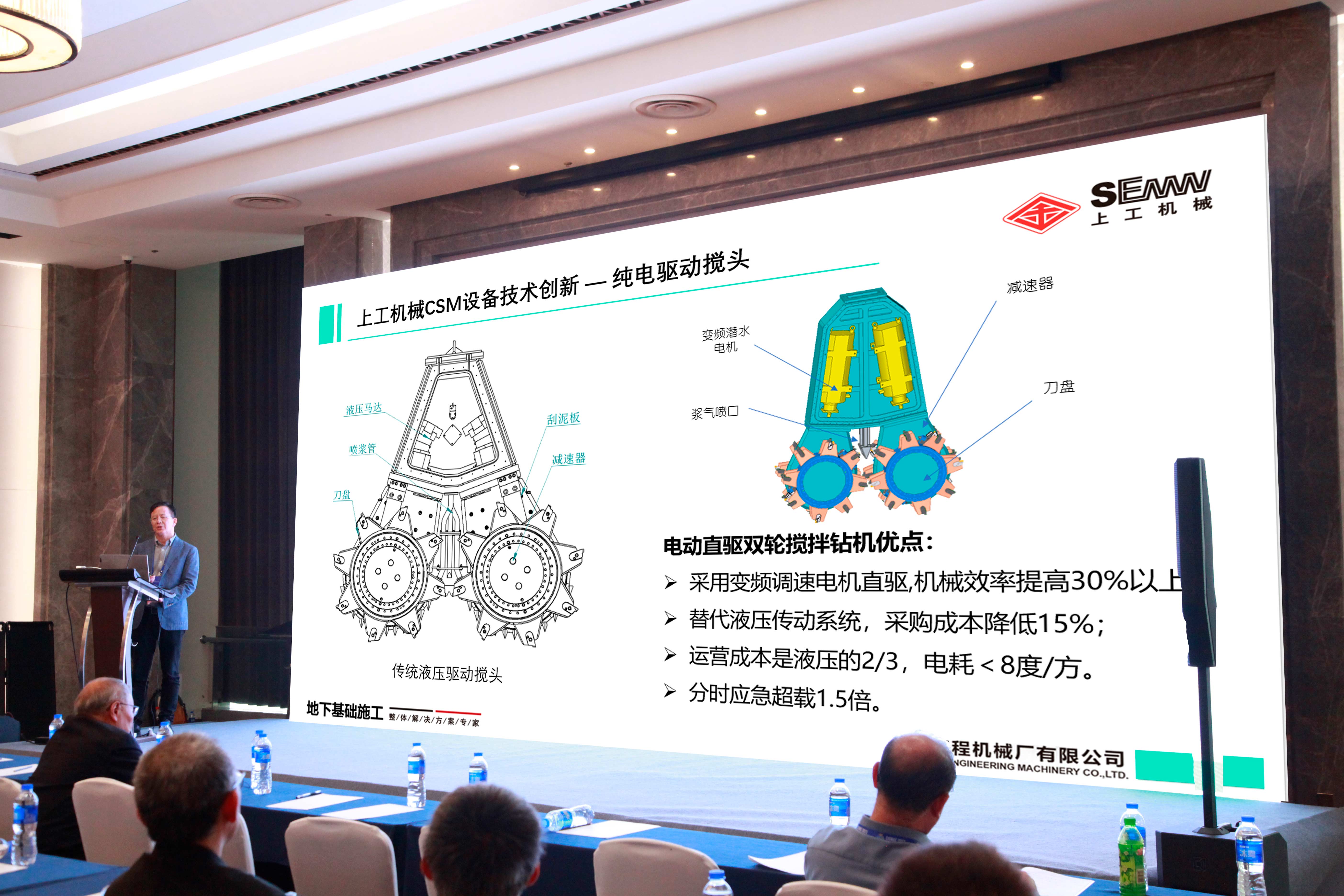 報告首先對(duì)CSM設備技術進(jìn)行概述,上工機械MS45雙輪攪鑽機産品采用純電驅動、變頻調速電機直驅效率高、運行成(chéng)本低、替代液壓傳動系統、采購成(chéng)本低,運營成(chéng)本是液壓的2/3,電耗低至8度/方,分時(shí)應急超載1.5倍,電機強制冷卻技術等多方面(miàn)技術創新點,然後(hòu)對(duì)CSM設備技術創新—鑽杆組合,將(jiāng)傳統CSM的漿管、氣管、冷卻液管和黃油管路由軟管變成(chéng)硬管集成(chéng)在鑽杆中,大大提高鑽杆拼接效率等先進(jìn)技術進(jìn)行闡述介紹。