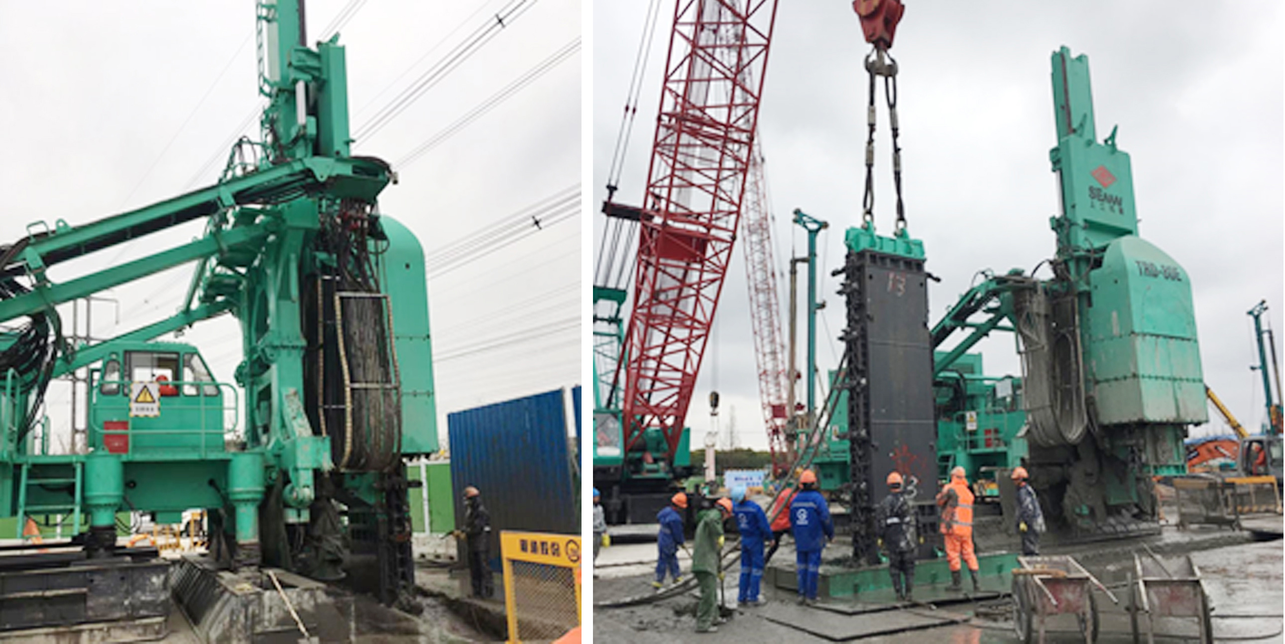 TRD工法:在向(xiàng)地下插入裝配有切割刀具鏈條的方形箱體、進(jìn)行橫向(xiàng)推進(jìn)成(chéng)槽的同時(shí),刀具鏈條進(jìn)行縱向(xiàng)切割攪拌,并從前端切削頭部向(xiàng)原 地基中噴射注入水泥漿,使得原地基中的土壤與注入的水泥漿進(jìn)行充分的混合攪拌,形成(chéng)等厚無縫水泥土攪拌連續牆。