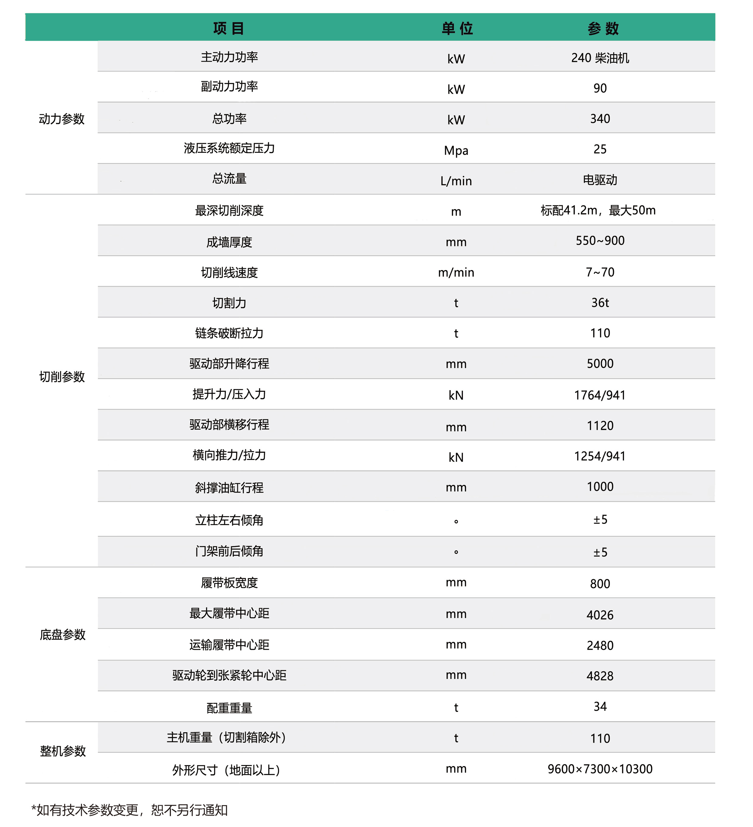 施工淨高度10m,最低高度6.8m,寬度5.7m,長(cháng)度9.5m,施工作業面(miàn)積小;全電驅動,節能(néng)環保、噪音小;最大施工深度50m,成(chéng)牆寬度550-900mm。