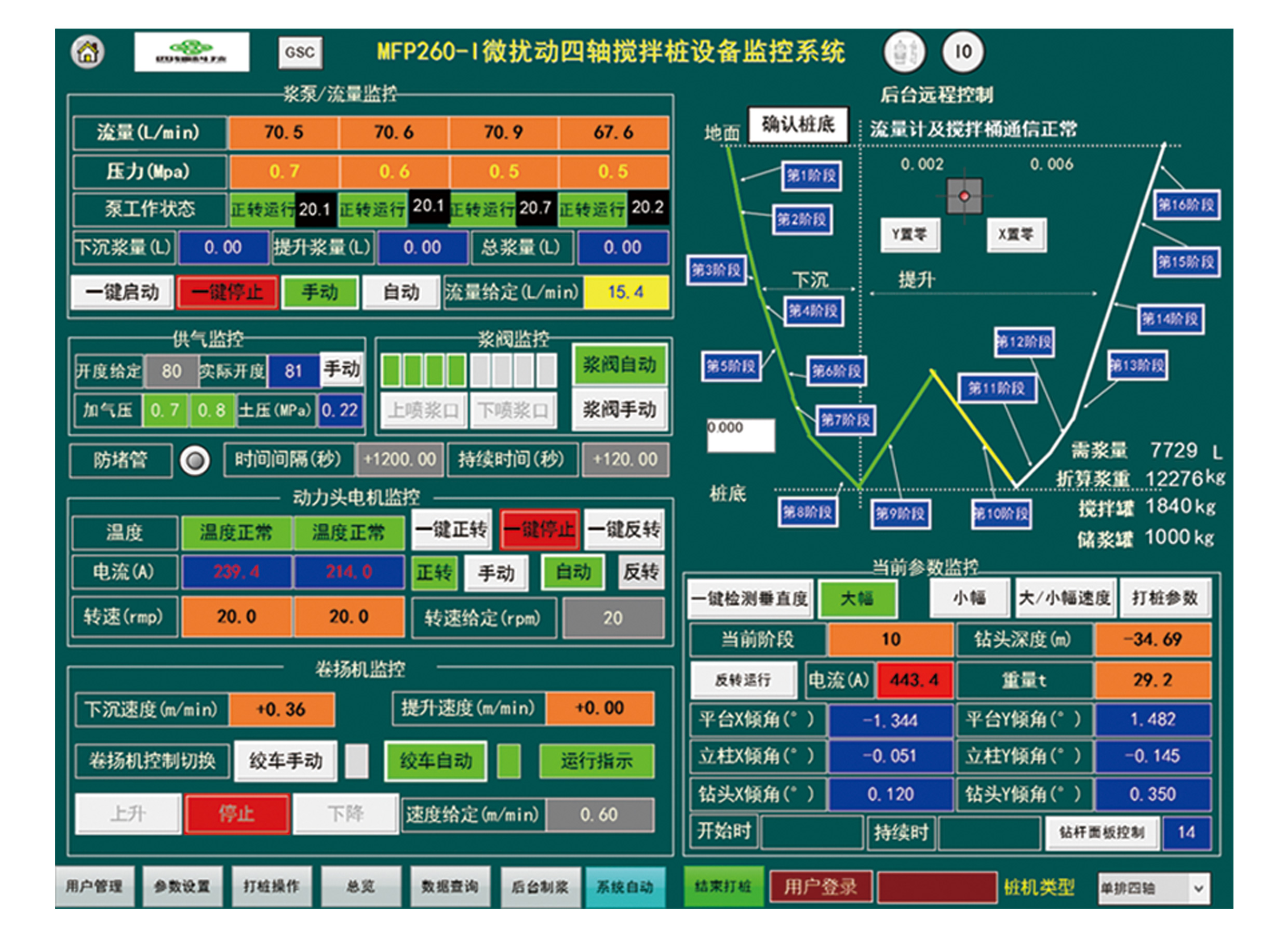 根據不同地質設定合适的水膠比、水泥摻量,設定鑽機各階段曲線的參數,包括樁深、卷揚速度、鑽杆轉速、噴漿流量、加氣與否、提升/下放、正轉/反轉等。