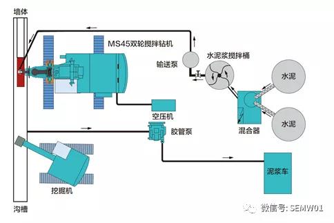 3.雙輪攪拌施工牆體中間咬合搭接≥0.3m,跳打施工